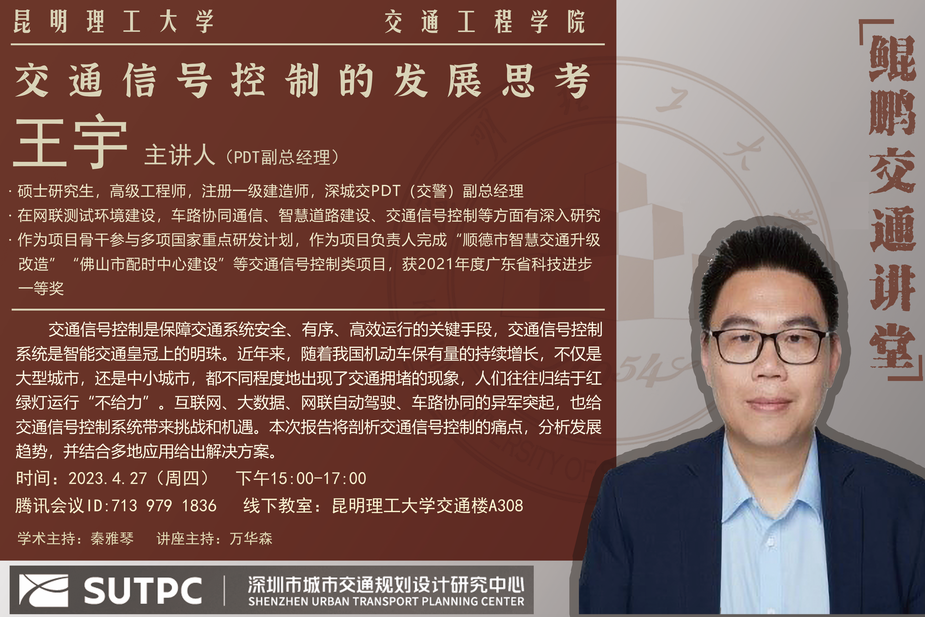 与深圳市城市交通规划设计研究中心(深城交)联合举办的“鲲鹏交通讲堂”,在交通楼A308开启了2023年的第二讲。深城交PDT(产品开发团队)交警业务线王宇副总经理带来了题为“交通信号控制的发展思考”的精彩报告,交通学院师生及昆工相关科研人员通过线下和线上视频会议的形式参加了此次学术讲座。