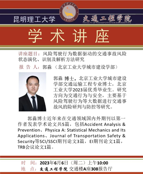 ,并作题为“风险驾驶行为数据驱动的交通事故风险状态演化、识别及解析方法研究”的学术报告,本次讲座由郭凤香教授主持,交通学院师生通过线下的形式参加交流学习。