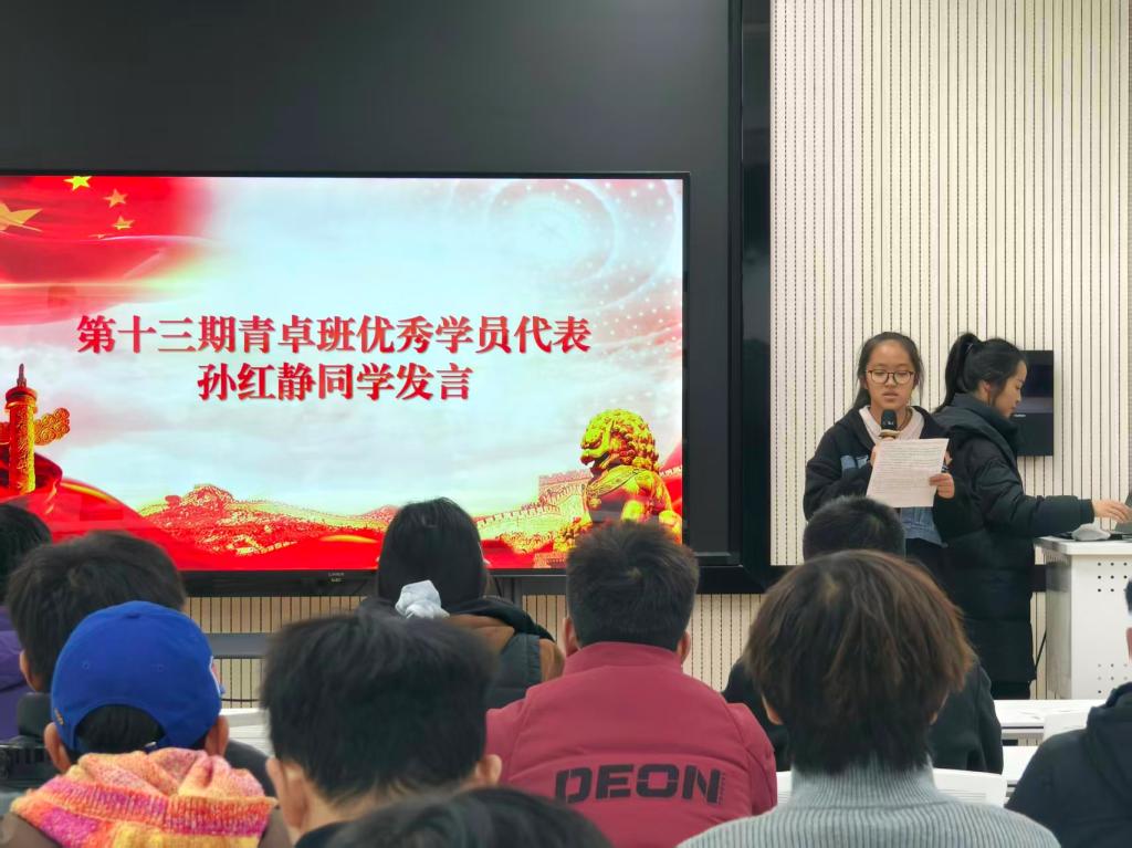仪式在庄严的国歌声中拉开帷幕。赵佳副书记为第十三期青卓班优秀学员颁发荣誉证书。优秀学员代表孙红静结合自身成长经历作分享发言,生动诠释了“青马工程”在坚定理想信念、锤炼品德修为方面的育人成效。