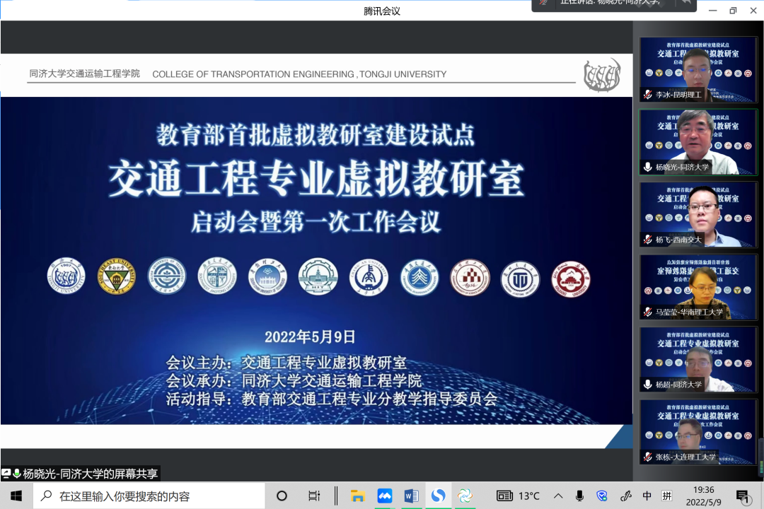 2022年5月9日,由同济大学牵头组建的教育部首批虚拟教研室建设试点“交通工程专业虚拟教研室”启动会暨第一次工作会议圆满召开,会议由虚拟教研室带头人、教育部交通工程专业分教学指导分委员会主任委员杨晓光教授召集,由秘书长杨超教授主持,东南大学、大连理工大学、西南交通大学、华南理工大学、哈尔滨工业大学、长安大学、重庆交通大学、昆明理工大学、兰州交通大学、新疆大学等作为成员高校参加了启动大会,学院秦雅琴教授在内的九名骨干教师参会。