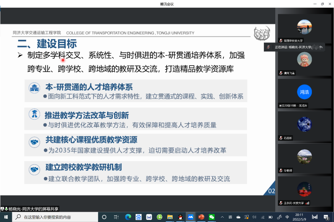 会议首先由杨晓光教授从交通工程专业虚拟教研室的建设背景、建设目标、组织方式与建设规划做了交流分享;然后,成员单位依次围绕“建立交流研讨制度和平台、定期开展跨校交流研讨”,“面向国家和行业需求、持续更新专业人才培养方案”,“基于OBE理念、推进课程建设和教育教学方法改革”,“创新智能化教研形态、促进课程和教学资源共享”,“辐射全国教师培训、培育跨校教学队伍”等5个主题从学校背景、专业建设需求以及任务工作的初步构想方面进行了交流研讨。