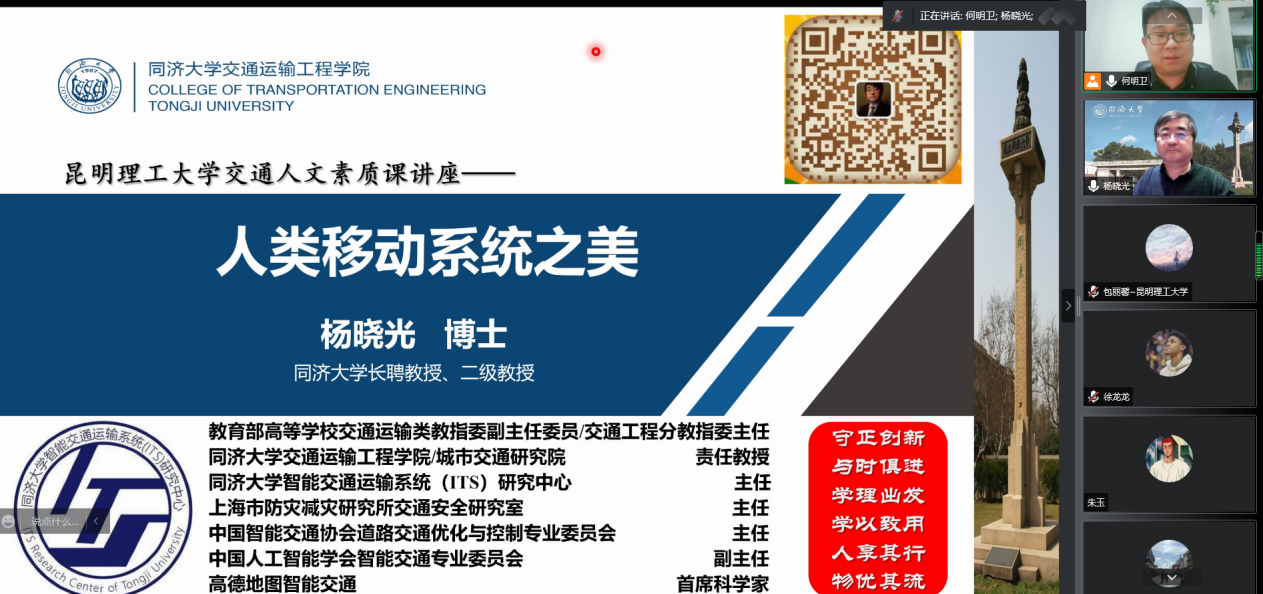 邀请,同济大学杨晓光教授为交通学院全院师生线上讲授了主题为“人类移动系统之美”的人文素质课程讲座。学校领导,探花视频