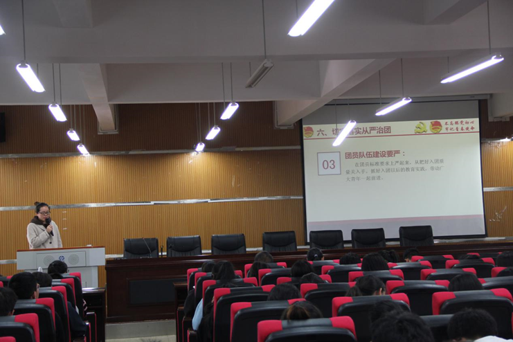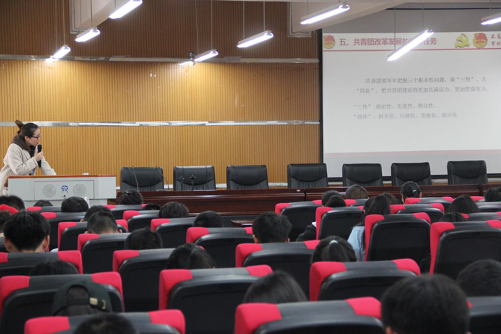 团委负责人晁洁同志主讲。前言讲述了习近平总书记的讲话,“青年一代有理想、有本领、有担当,国家就有前途,民族就有希望。”中国青年运动的时代主题:为实现中华民族的伟大复兴的中国梦而奋斗!共青团的地位:是党的助手和后备军。而共青团要做好党的助手和后备军就要抓好三个根本性问题:必须把培养社会主义建设中和接班人作为根本任务;把巩固和扩大党执政的青年群众基础