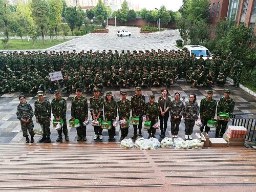 在慰问中,首先是2017级的辅导员晁洁老师向同学们送去关心慰问,鼓励参训同学们坚持就是胜利,在军训中严格要求自己的同时要注意身体健康,军训很辛苦,希望同学们发扬吃苦耐劳的光荣传统,保持良好的精神状态,持之以恒,再接再厉,祝福同学们以优异的成绩取得军训的圆满成功。随后,王懿娜老师代表学院向新生们表达了学院对他们的关怀和殷切希望,鼓励同学们要不怕苦不怕累,投入到军训这个大熔炉里,接受各种锻炼,培养吃苦耐劳和坚持到底的精神,锻炼严肃认真,一丝不苟,精益求精的品格,圆满完成各项训练任务,并将军训中收获的体会和精神带入到接下来的大学学习生活中,积极进取,奋勇争先,让大学的的四年青春更加绚丽多彩。最后,学生工作办公室的辅导员们给军训新生们分发了可乐和鲜美可口的梨,并说同学们军训辛苦了。